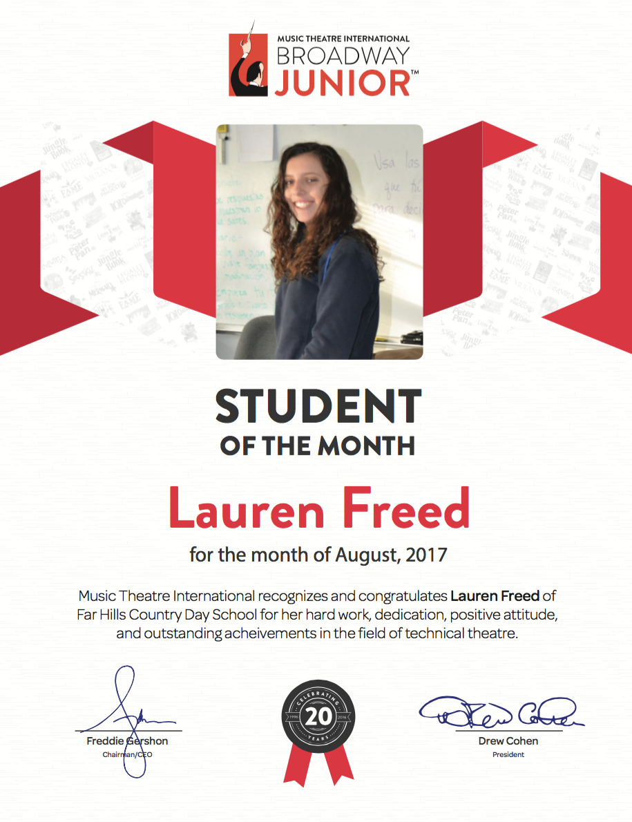 Our Broadway Junior Student of the Month for August 2017 is Lauren Freed from Far Hills Country Day School in Far Hills, NJ