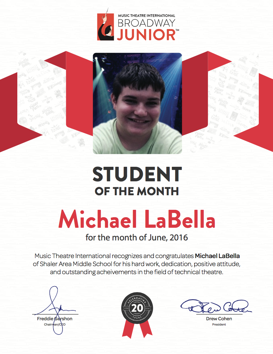 Our Broadway Junior Student of the Month for June 2016 is Michael LaBella from Shaler Area Middle School in Glenshaw, PA.