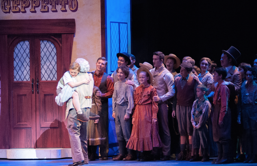 Topher Cundith as Pinocchio and cast in Disney's My Son Pinocchio: Gepetto's Musical Tale at Music Theatre Wichita (Photo © Jerry Fritchman).
