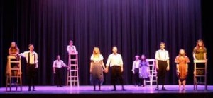 As for scenery, Matt Lord provided about as little as you see in a production of Our Town. Ladders and chairs were pretty much all that was shown. Thus, the characters not in any given scene climbed the ladders and observed the characters involved in the action. Occasionally they functioned as a German version of the Greek chorus.