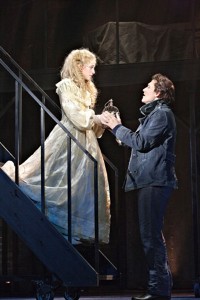 Put to good use by Razze was what has become known in the trade as a “Harold Prince bridge” (although Prince didn’t use one when he directed the original Sweeney Todd). Razze had two actors move some staircases on wheels so that when a character on the upper level needed to get down to the stage, there’d be a staircase waiting for him. (By the way, these staircases provided all the “choreography” that one can expect from a Sweeney Todd.)