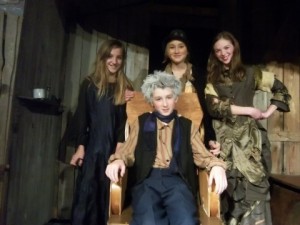Sweeney Todd has often been described as “Grand Guignol,” named for that theater in Paris that specialized in plays with exaggerated acting and melodramatic effects. Razze kept to that concept by starting the show with an eerie-looking man, wearing ragged clothes and a distressed top hat, peering at the audience through a large magnifying glass. Another gentleman (if we can call him that) played a few haunting notes on a concertina.