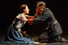 No set really means no set. There’s no long table at which the soldiers eat their meals, although there are chairs. Soup spoons are in evidence but bowls are not. When the soldiers play billiards, they hold cues over an invisible pool table. True, Jane Cox’s wonderful rococo lighting helps immeasurably in creating mood. But Doyle has always believed that less is more – mostly because his Watermill Theatre in England has never been able to afford even quasi-lavish productions. Still, in this era when frugal is the new cool, feel free to minimize and minimalize.
