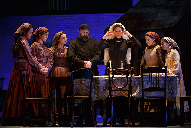 Maybe the Anatevkans should have given more thought to why traditions came into being, but as the show starts, they certainly don’t question their rituals. Here comes Yente the matchmaker ready to fix up Tevye and Golde’s daughter Tzeitel with the very wealthy (albeit old and overweight) Lazar Wolf. Tzeitel might have even been willing to marry him if she hadn’t fallen in love at an early age with Motel, who’s become the town’s tailor. But now, with a different kind of Wolf nearly at the door, Tzeitel (as beautifully played by Alexandra Silber) comes close to having a breakdown. And when you think of it, wouldn’t that happen to a young woman who’s been fearing Yente’s visit all along?