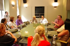 Myrna and Freddie Gershon host a discussion with eight educators this past July at the MTI office in NYC. Photo by Marcus Woollen.