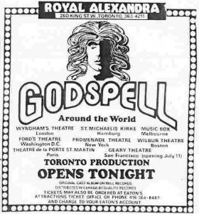 The London cast wasn't the only to boast soon to be famous actors. Toronto's production, which opened May of '72, included Victor Garber, Eugene Levy, Martin Short, Gilda Radner, and Andrea Martin with music direction by Paul Shaffer. At the time of the Toronto opening, seven productions in six countries were running. San Francisco was soon to make nine.GODSPELL continued its steady climb to notoriety in 1973 with the release of the film adaptation. Starring Toronto's original Jesus, Victor Garbor, the film made GODSPELL and Schwartz alike, a household name.