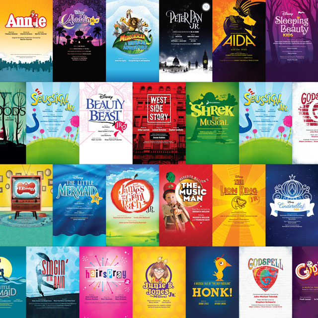 Subplot Studio’s team of professional artists and marketers have created dynamic poster templates easily customizable with your organization name, show dates, times, credits and contact information. When you license a musical and purchase the show’s official Logo Pack from MTI, you can use it in conjunction with the superbly designed templates from our friends at Subplot Studio. The customized posters can then be instantly downloaded as a pdf, and you’ll also have the option of ordering high-quality prints. In addition, the Design Bundle option also includes social media graphics to use in conjunction with your print marketing: