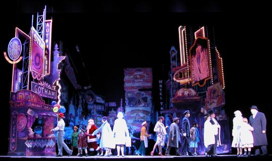 Constructed in 2003, this one trailer rental designed by Kenneth Foy has multiple drops, hangers and props that fit most theaters with plentiful line sets (approx. 35). Our set features iconic locations including a magnificent mansion, an ominous orphanage, and a delightful Times Square!